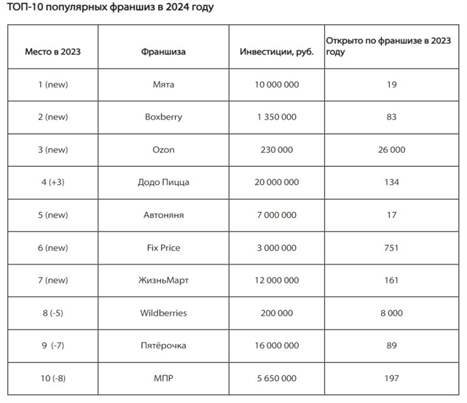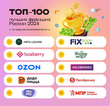 Значительно претерпел изменение ТОП-10, в который попало сразу несколько новых имен. Тройка лидеров прошлогоднего рейтинга 2023 года, «Пятёрочка», «МПР» и Wildberries, по-прежнему остались в числе самых популярных российских франшиз, но теперь уступили позиции другим крупным брендам. Теперь их сменили франшизы премиальных лаунж-баров Мята Lounge, логистикой службы Boxberry, пунктов выдачи Ozon.