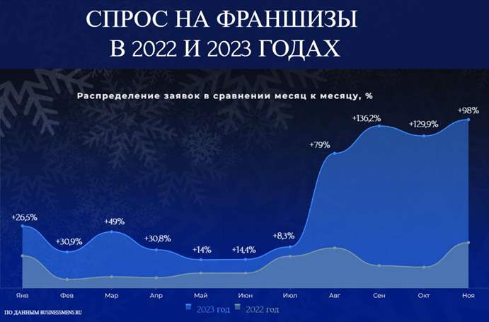 По итогам 2023 года рынок франчайзинга демонстрировал рост по сравнению с 2022 годов. Согласно внутренней статистике Businessmens.ru, основанной на данных по количеству заявок, за одиннадцать месяцев 2023 года по сравнению аналогичным периодом 2022 года спрос на франшизы вырос на 57,7%.