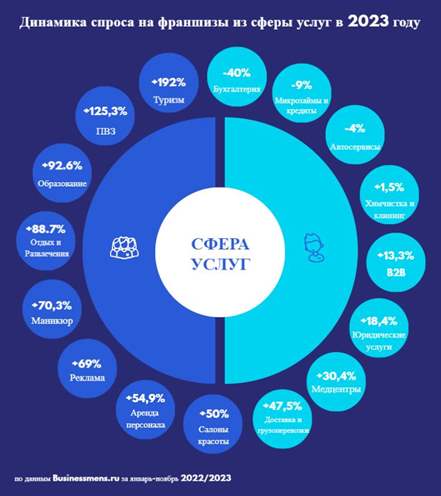В сфере услуг наибольший рост по заявкам в 2023 году показали франшизы туризма (+192%), пунктов выдачи заказов (+125,3%), образования и обучения (+92,6%) и отдыха и развлечения (+88,7%). Также еще целый ряд направлений сервисных франшиз показал рост по заявкам 50% и выше. Это франшизы маникюра (+70,3%), рекламные услуги (+69%), аренды персонала (+54,9%), салоны красоты (+50%).
