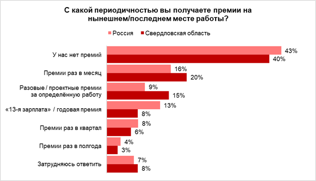 Каждый пятый трудоустроенный свердловчанин получают премии раз в месяц. Причем ежемесячное премирование наиболее распространено среди работников розничной торговли (26%) и производства (23%).