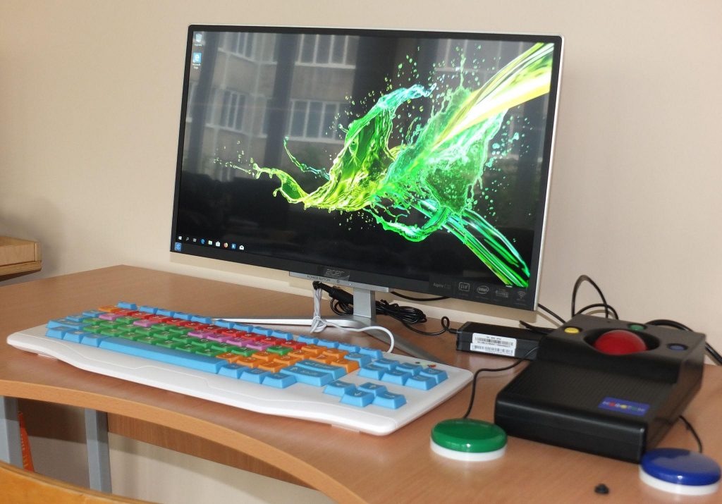 Что еще может понадобиться: специальная клавиатура с большими кнопками и разделяющей клавиши накладкой, головная компьютерная мышь, выносные компьютерные кнопки, компьютерный джойстик или компьютерный роллер.
