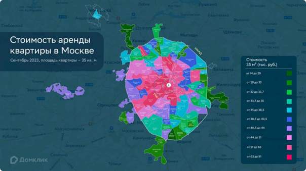 Самые дорогие — районы в западной части Центрального округа, такие как Пресненский, Хамовники, Арбат, Замоскворечье, Якиманка и Тверской. Медианная стоимость аренды квартиры площадью 35 м 2 обойдётся от 65 тыс. до 91 тыс. рублей. Эти же районы лидируют по объёму предложения (44% от общего количества объявлений): почти каждое второе объявление о сдаче квартиры в аренду приходится на эти районы.