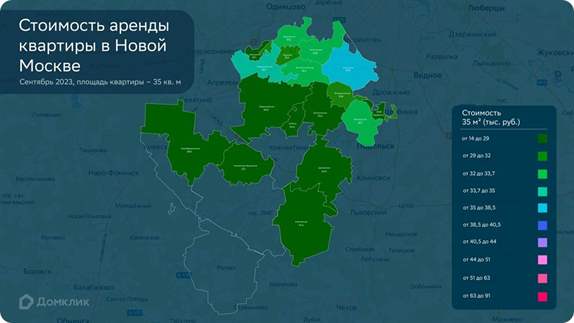 В Новомосковском округе предложений больше, особенно в поселениях Сосенское и Московский. Поскольку округ примыкает к МКАД и обладает более развитой транспортной и социальной инфраструктурой, медианная стоимость аренды типовой 35-метровой квартиры здесь выше — от 20 до 35 тыс. рублей. Дешевле всего аренда в самых отдалённых поселениях — Кокошкино (20 тыс.), Щербинке (25 тыс.) и Десёновском (27 тыс.).